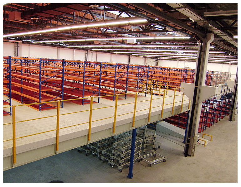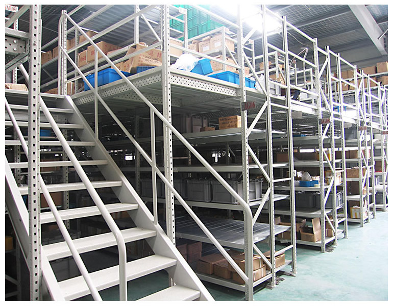 阁楼式货架系统是在已有的工作场地或货架上建一个中间阁楼,以增加存储空间,可做二、三层阁楼,宜存取一些轻泡及中小件货物,适于多品种大批量或多品种小批量货物,人工存取货物.货物通常由叉车、液压升降台或货梯送至二楼、三楼,再由轻型小车或液压托盘车送至某一位置。 近几年多使用冷轧型钢楼板,它具有承载能力强、整体性好、承载均匀性好、精度高、表面平整、易锁定等优势.有多种类型可选,并且易匹配照明系统,存取、管理均较为方便。单元货架每层载重量通常在500kg以内,楼层间距通常为2.2m~2.7m,顶层货架高度一般为2m左右,充分考虑工作人员操作的便利性。 楼层设计根据各种安装情况定制,可在现场轻松装配,无需焊接。阁楼货架系统在汽车零部件领域、汽车4S店、轻工、电子等行业有较多应用。